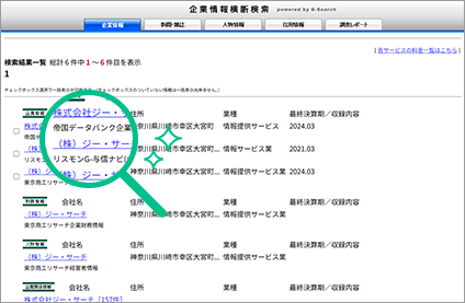 G-Searchデータベースサービスでは、帝国データバンクや東京商工リサーチなど国内の主要調査会社の情報を提供。