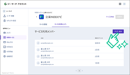 フリーPlus、ベーシックプランでは、G-Searchデータベースサービスの企業情報や新聞記事情報のデータベースも、追加したメンバー全員が利用できます。