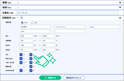 地域や業種での条件に加え、抽出対象の絞り込みに効果的な検索条件を指定することが出来ます。