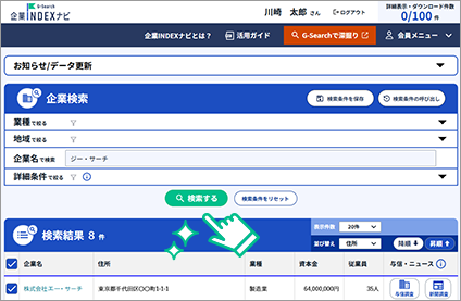 また、企業名検索を使って、特定企業を検索し、詳細情報、深堀り情報を取得することができます。